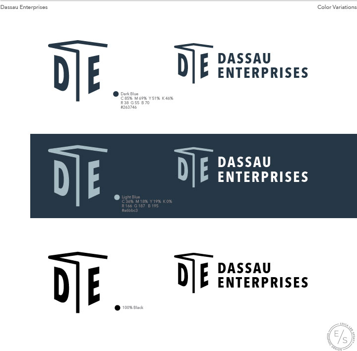 The client liked the idea of using a text treatment to the D and E of the company title. playing off the theme of packaging, while also not ignoring the other aspects of the business such as printing, display, and design, I played with an open design suggesting the structure of a box. Placing the D and E on either side and adjusting for an illusion of perspective gave subtle shape to the logo. The use of a blue color palette invokes trust and authority, while the dark contrast of the navy and bluish grey add a feeling of sophistication.